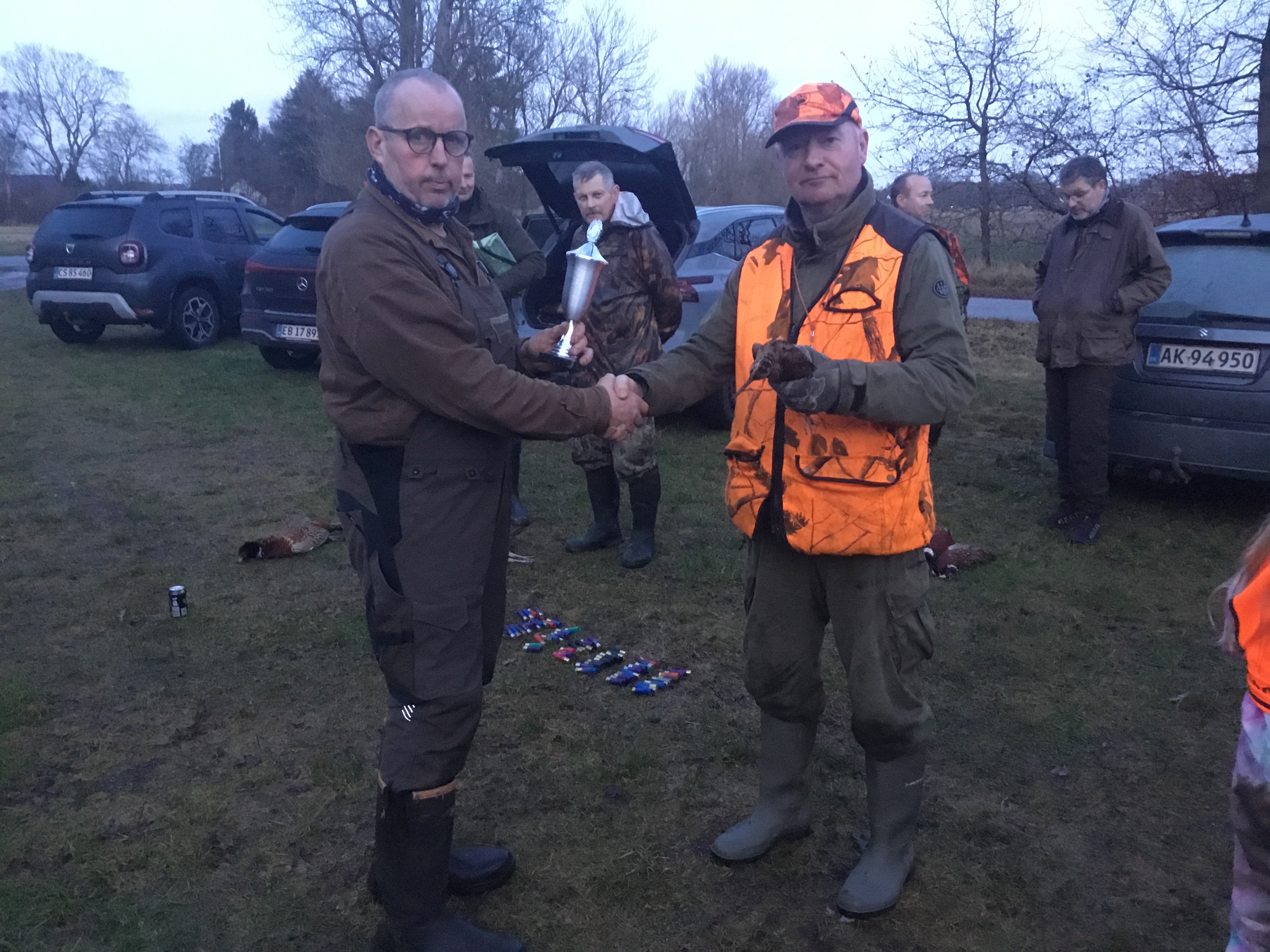 Lars takkede alle for en god dag og på paraden lå der et fint vildtudbytte for dagens jagt. Herefter blev vildtet solgt på auktion. Vinder af dagens bengæt ( 40 stk ) blev Ove Munk. Jan Justsen fik overrakt sneppepokalen, for at have nedlagt den første sneppe i år. På paraden mangler der det nedlagte rådyr, det skyldes at skytten/købte rådyret og var taget afsted inden den afsluttende parade. Jesper sluttede af med at blæse jagt forbi på jagthornet.