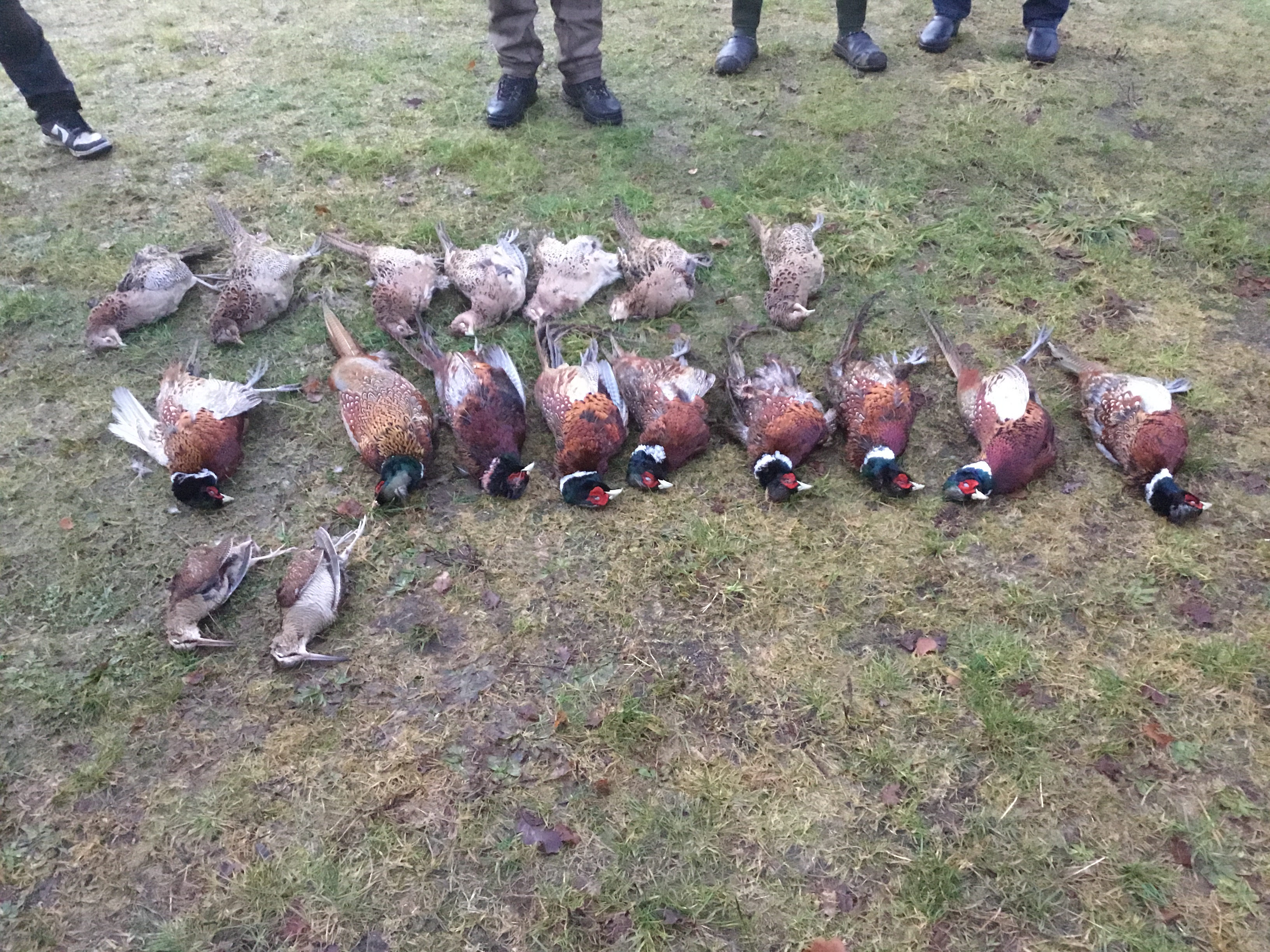 Efter frokostpausen kørte vi til Melholtvej og her viste det sig at der var rigtig mange fasaner i dag. Der blev leveret ikke mindre end 16 fasaner, der kunne have været en mere hvis ikke en hund havde fortæret den. Der blev også skudt en sneppe. Der var flere fasaner der undgik jægernes haglskud, der blev også set et enkelt rådyr.
